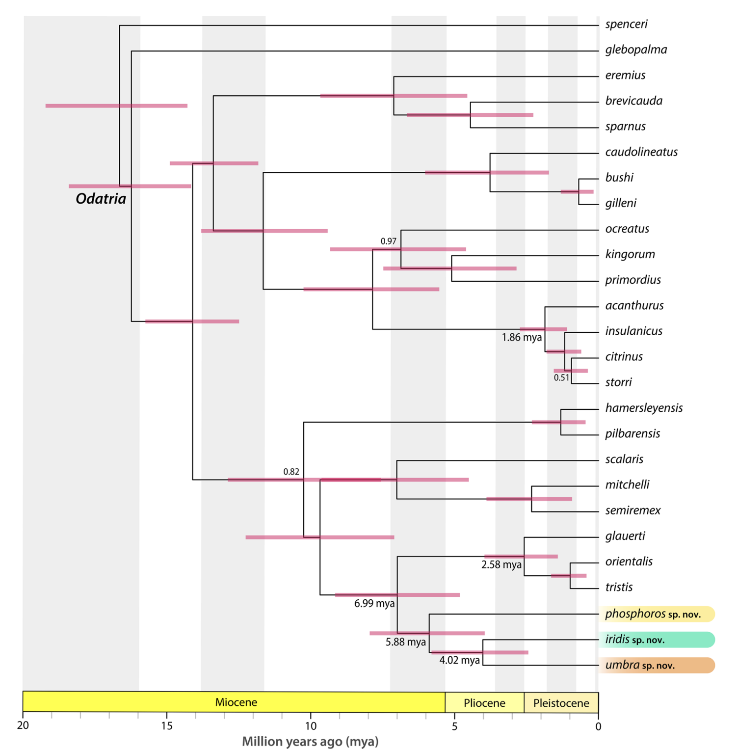 Sequencing, data analysis and writing ended up being a fairly rapid process relative to what some descriptions take. Fortunately for us, the results rather obviously supported the existence of three new species. The three form a relatively old clade that split from their closest relatives, the clade containing tristis, orientalis, kuranda, and glauerti, around 7 million years ago (probably). The youngest split — between iridis and umbra — occurred about 4 million years ago (again roughly — I’m rather dubious about divergence dating). Importantly though, these predate several other splits (regardless of absolute timing), such as between mitchelli and semiremex, and many of the spiny-tailed species. I find it rather interesting that they appear significantly older than the tristis and glauerti split, despite the younger two differing more widely in morphology. With this genetic evidence and some diagnostic morphological characters we had all we needed, although I certainly don’t recommend trying to count their midbodies. Most writing occurred in the second half of 2024 and early 2025, before initial submission mid 2025, acceptance in November 2025 after one round of review, and then publishing in February 2026. A boring sentence, sure, but I think a lot of people don’t realise how long these things take to get out there and that taxonomists are just slow. Papers really are a drag to produce, and the last couple months of waiting for proofs to check, and then trying to fix errors while others magically appeared in the manuscript was painful. Slightly unfortunately for us, two other Odatria papers were published right before ours, leaving us without time to make some minor tweaks and making it very slightly outdated immediately. I don’t think they stole too much of our thunder though and we put together a really sound and thoughtful (credit to Stephen and Carlos for this part) manuscript. With the ever-improving state of genomic sequencing and analysis, it would be good to see more future papers incorporate some of these advances to produce even more robust revisions.